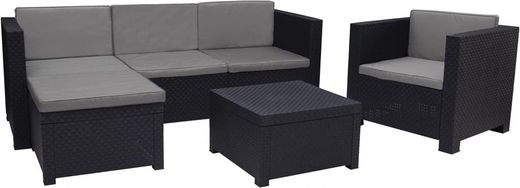 L'ensemble de meubles Manhattan est en rotin plat et se compose d'un canapé trois places, d'un fauteuil individuel et d'une table. Avec son design innovant, il sera le complément parfait à notre jardin ou terrasse. Grâce à sa composition totale en résine, l'ensemble résiste à l'oxydation et vous pourrez l'utiliser pendant de nombreuses saisons. Pour prolonger la durée de vie de votre salon de jardin, il est conseillé de le recouvrir d'une housse de protection et de le ranger dans un endroit frais et aéré pendant les saisons où il n'est pas utilisé.